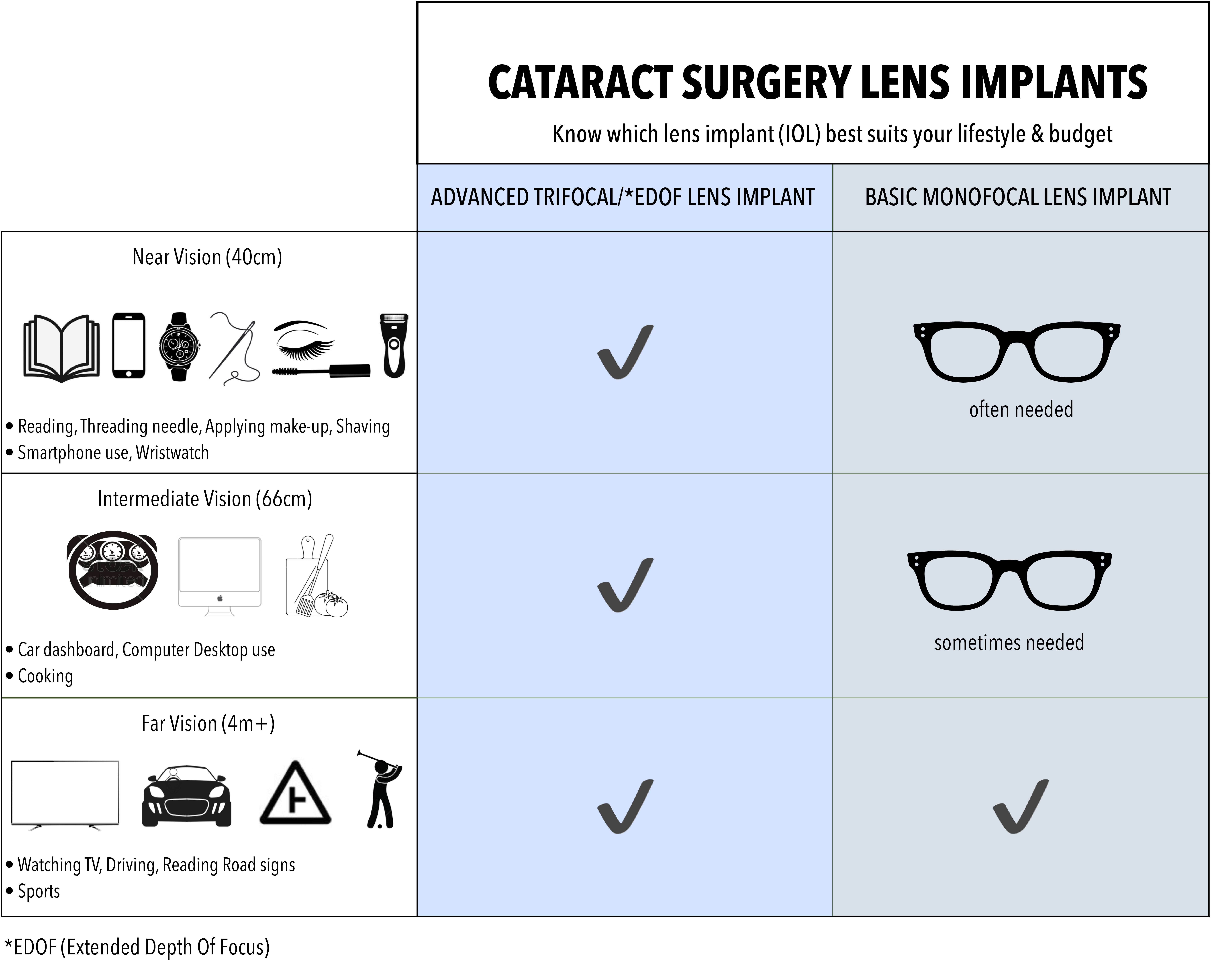 Your dependence on spectacles/contact lenses after surgery will depend on the type of lens implant you select for your cataract surgery. There are 2 broad categories of lens implants: [Advanced lens implants (Trifocal, EDOF, Toric) versus Basic lens implants